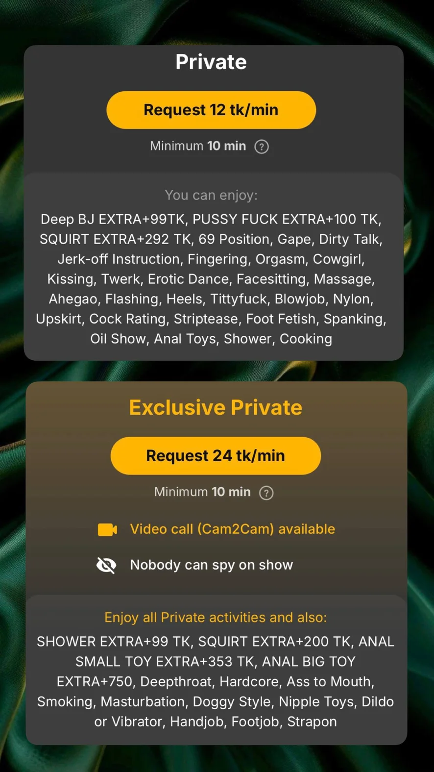 高潮脸, 快闪裸体, 高跟鞋, 乳交, 口交, 丝袜, 裙底风光, 大屌评分, 脱衣舞, 恋足, 鞭打, 精油表演, 后庭玩具, 洗澡, 烹饪, Deep BJ EXTRA+99TK, PUSSY FUCK EXTRA+100 TK, SQUIRT EXTRA+292 TK, 开肛, 下流話, 手淫指导, 指交, 高潮, 骑乘女, 接吻, 电臀舞, 色情舞, 骑脸, 69姿势, 按摩, SHOWER EXTRA+99 TК, SQUIRT EXTRA+200 TK, ANAL SMALL TOY EXTRA+353 TK, ANAL BIG TOY EXTRA+750, 深喉, 粗暴, 肛交到口交, 抽烟, 自慰, 狗式, 乳头玩具, 假阳具或震动器, 打飞机, 足交, 穿戴式阳具